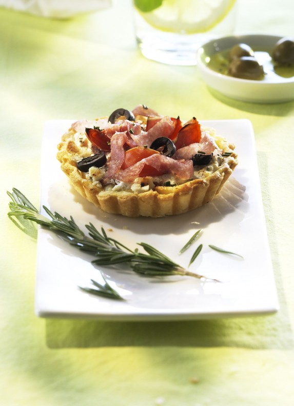 Préchauffez le four à 220 °C. Graissez les moules avec l'huile d'olive et insérez la pate feuilletée dans les moules. Piquez la pâte à plusieurs reprises avec une fourchette et badigeonnez d'huile d'olive. Lavez le romarin, égouttez-le, enlevez les tiges et hachez finement les feuilles. Coupez les tomates cerises en quartiers ainsi que les olives en rondelles. Coupez le jambon sec Môssieur Polette en lamelles. Mélangez la ricotta, la moitié du jambon, le romarin et les olives. Salez, poivrez. Répartissez le mélange dans les moules et complétez avec les quartiers de tomates. Cuire 10 à 12 minutes au four. A la fin de la cuisson, démoulez les tartes et ajoutez les lamelles de jambon sec restantes.